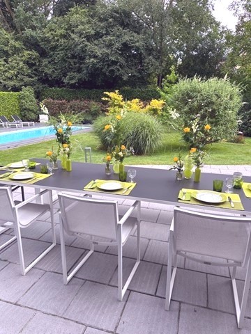 Le petit déjeuner est servi dans la salle à manger ou sur la grande terrasse au coeur d'un écrin de verdure.